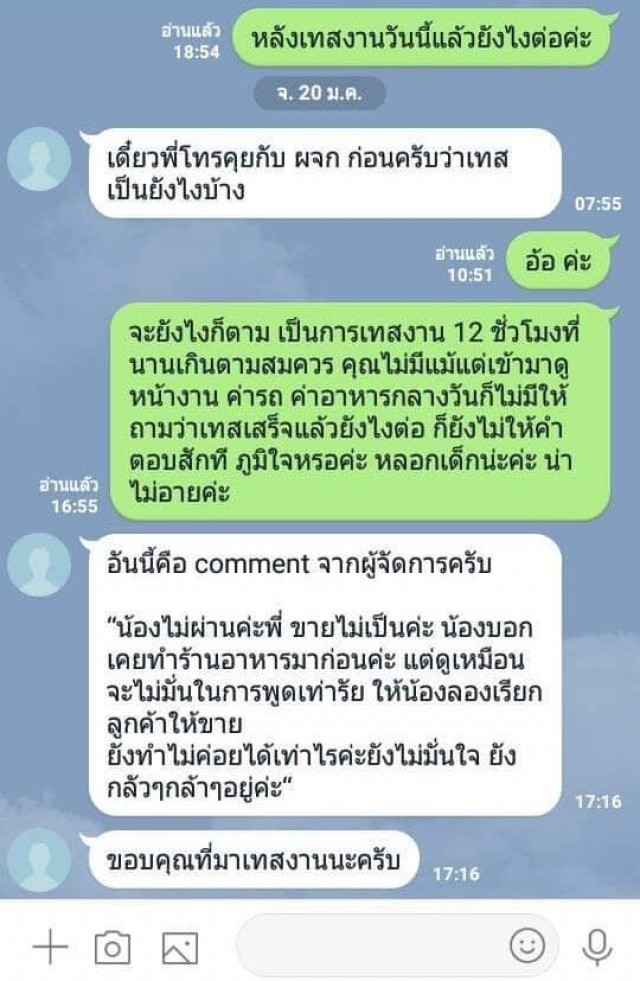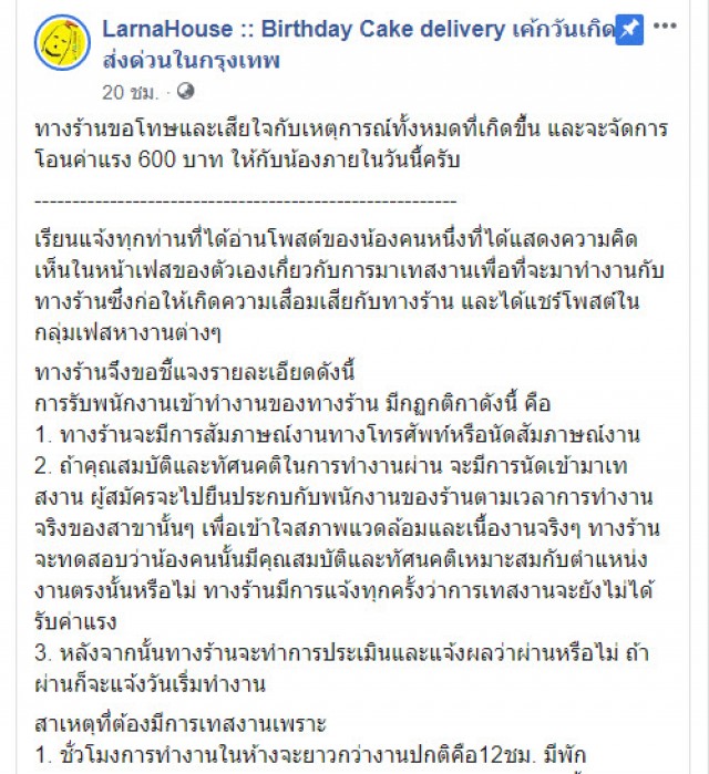 เป็นอีกหนึ่งเรื่องราวที่โซเชียลเข้ามาแสดงความเห็นกันเป็นจำนวนมาก หลังมีผู้ใช้เฟสบุ๊ครายหนึ่งได้ออกมาโพสต์แชทสนทนา ร้านเค้กชื่อดังหัวหมอ ให้ไปเทสงานก่อนจะรู้ว่าจะรับทำงานหรือว่าไม่รับ แต่การเทสงานไปว่า 12 ชั่วโมง ซึ่งนานเกินควร และยังไม่ได้ค่าจ่างอีกด้วย