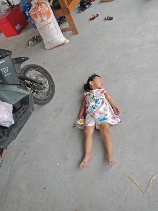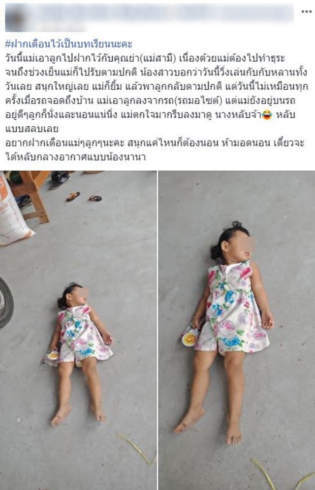 โดยมีข้อความระบุว่า วันนี้แม่เอาบุตรสาวไปฝากไว้กับแม่สามี เนื่องด้วยแม่ต้องไปทำธุระ จนถึงช่วงเย็นก็ไปรับตามปกติ น้องสาวบอกว่าวันนี้วิ่งเล่นกันกับหลานทั้งวันเลย แล้วพาบุตรสาวกลับตามปกติ แต่วันนี้ไม่เหมือนทุกครั้งเมื่อรถจอดถึงบ้าน อุ้มบุตรสาวลงจากรถมอเตอร์ไซต์ แต่แม่ยังอยู่บนรถ อยู่ดีๆ บุตรสาวก็นั่งและนอนนิ่ง แม่ตกใจมากรีบลงมาดู นางหลับจ้า หลับแบบสลบเลย