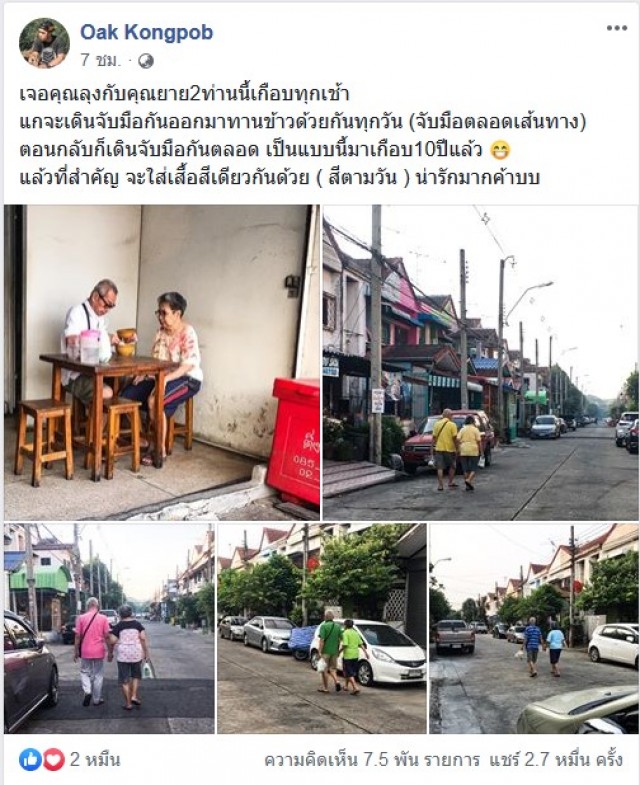 กลายเป็นอีกภาพที่สร้างรอยยิ้มและความประทับใจให้แก่ผู่ที่พบเห็นและชาวโซเชียลเป็นจำนวนมาก เมื่อได้มีผู้ใช้เฟซบุ๊ค Oak Kongpob ได้โพสต์ภาพความน่ารักของคุณลุงกับคุณป้าทั้งสองท่าน ที่ได้เดินจับมือพากันไปกินข้าวในทุกๆเช้า ตลอดระยะเวลา 10 ปี และคุณลุงและคุณป้ามักจะใส่เสื้อสีเดียวกันตลอดโดยจะใส่เสื้อตามสีของวัน ซึ่ง Oak Kongpob ได้โพสต์ภาพพร้อมข้อความใจความว่า
