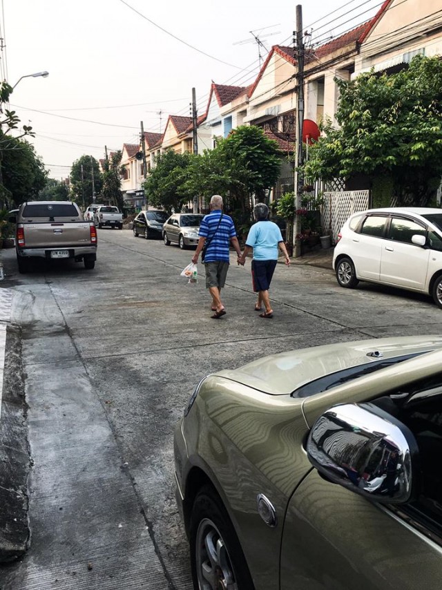 เจอคุณลุงกับคุณป้า 2 ท่านนี้เกือบทุกเช้า แกจะเดินจับมือกันออกมาทานข้าวด้วยกันทุกวัน จับมือตลอดเส้นทาง ตอนกลับก็เดินจับมือกันตลอด เป็นแบบนี้มาเกือบ10ปีแล้ว แล้วที่สำคัญ จะใส่เสื้อสีเดียวกันด้วย สีตามวัน น่ารักมากค้าบบ