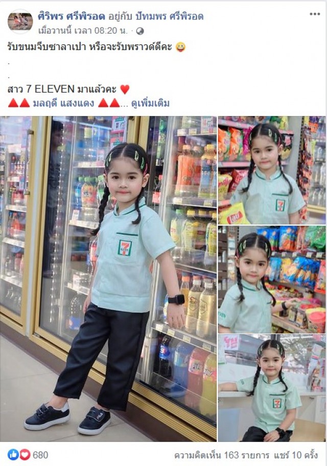 กลายเป็นอีกภาพที่สร้างรอยยิ้มให้แก่ผู้ที่พบเห็นและชาวโซเชียลและชาวโซเชียลเป็นจำนวนมาก เมื่อได้มีผู้ใช้เฟซบุ๊ค ศิริพร ศรีพิรอด ได้โพสต์ภาพของหนูน้อยคนหนึ่งที่ได้แต่งชุดพนักงานเซเว่น พร้อมข้อความใจความว่า รับขนมจีบซาลาเปา หรือจะรับพราวด์ดีคะ