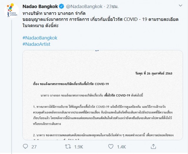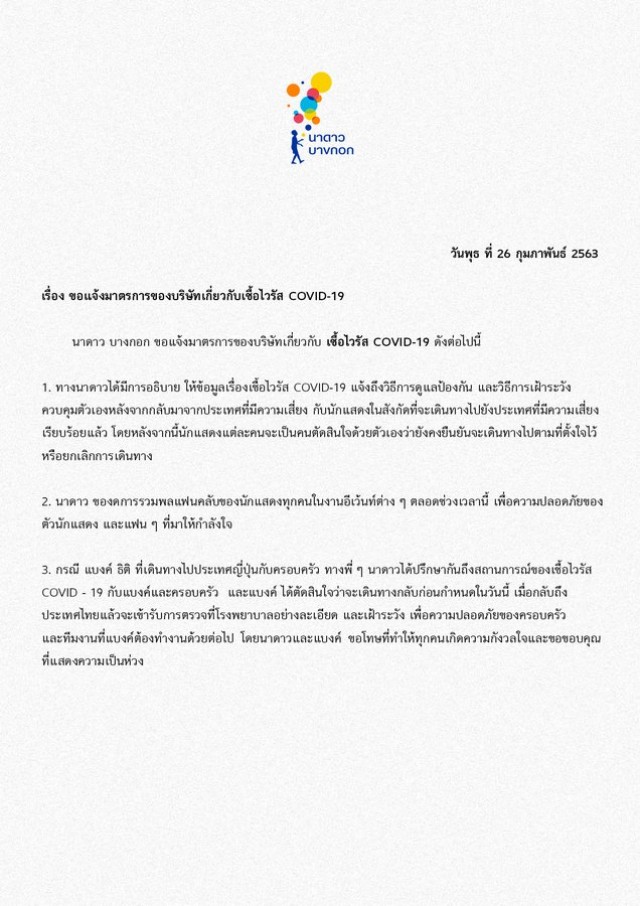 1 ทางนาดาวได้มีการอธิบาย ให้ข้อมูลเรื่อง COVID 19 แจ้งถึงวิธีการดูแลป้องกัน และวิธีการเฝ้าระวัง ควบคุมตัวเองหลังจากกลับมาจากประเทศที่มีความเสี่ยง กับนักแสดงในสังกัดที่จะเดินทางไปยังประเทศที่มีความเสี่ยง เรียบร้อยแล้ว โดยหลังจากนี้นักแสดงแต่ละคนจะเป็นคนตัดสินใจด้วยตัวเองว่ายังคงยืนยันจะเดินทางไปตามที่ตั้งใจไว้ หรือยกเลิกการเดินทาง