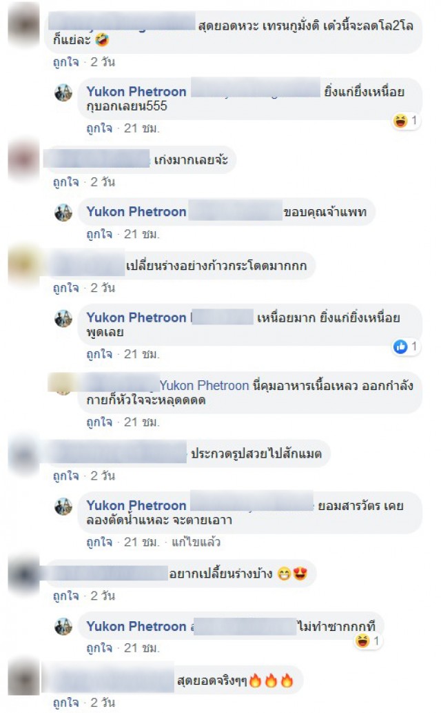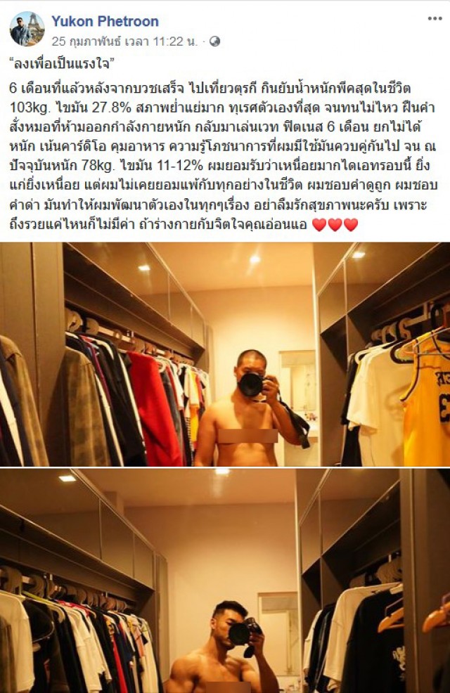 กลายเป็นอีกเรื่องราวที่สร้างแรงบันดาลใจให้กับผู้คนที่พบเห็นและชาวโซเชียลเป็นจำนวนมาก เมื่อได้มีผู้ใช้เฟซบุ๊ค Yukon Phetroon ได้โพสต์เรื่องราวถึงการเปลี่ยนแปลงตัวเอง ซึ่งหนุ่มคนนี้ได้เริ่มเปลี่ยนแปลงตัวเองจากการเป็นคนอวบที่เคยหนัก 103 กก ใช้เวลาเพียงแค่ 6 เดือนจนปัจจุบันเหลือเพียง 78 กก ซึ่งหนุ่มคนดังกล่าวได้เปิดประสบการณ์ ระบุข้อความว่า