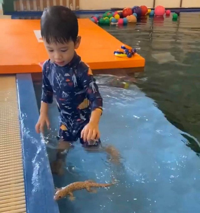 เดี๋ยวน้องโพธิ์ช่วยสอนตุ๊กแกว่ายน้ำเองนะ