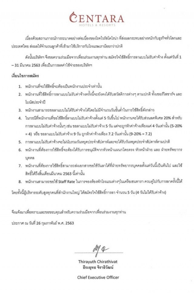 ประธานเจ้าหน้าที่บริหาร โรงแรมและรีสอร์ตในเครือเซ็นทารา ออกประกาศขอความร่วมมือพนักงานสมัครใจใช้สิทธิ์การลาแบบไม่รับค่าจ้าง 1 เดือน หวังลดค่าใช้จ่ายของบริษัท