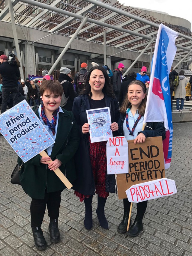 เรื่องราวนี้ก็ได้ถูกนำเสนอเข้าโหวด โดย Monica Lennon ภายใต้ชื่อ The Period Products เขาเสนอให้กับผู้หญิงนั้นให้ได้รับผลิตภัณฑ์ผ้าอนามัยได้ใช้ฟรี ผ่านร่างกฎหมายแจกผ้าอนามัยแบบแผ่นและแบบสอดให้สตรีทุกคนฟรีเป็นชาติแรกในโลก โดยจะแจกตามสถานที่สาธารณะ เช่น ศูนย์ชุมชน สโมสรเยาวชน นั่นหมายความว่า ประเทศสก็อตแลนด์ จะกลายเป็นประเทศแรกของโลกที่ให้สิทธิการใช้สินค้ากลุ่มนี้ฟรีอย่างถ้วนหน้า