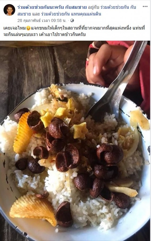 กลายเป็นอีกหนึ่งเรื่องราวที่สร้างความแปลกใจให้กับผู้คนที่พบเห็นและชาวโซเชียลเป็นจำนวนมาก เมื่อได้มีผู้ใช้เฟซบุ๊ค ร่วมด้วยช่วยกันนะครับ กับสมชาย ได้โพสต์ถึงเรื่องราวที่ได้ไปแจกขนมให้กับน้องๆที่ยากจนในพื้นที่ที่ห่างไกล ซึ่งเป็นขนมทั่วไปที่น้องๆจะชอบกินกัน แต่น้องกลุ่มนี้กลับเอาขนมเหล่านี้ไปราดข้าว แทนการที่จะกินเหมือนน้องๆทั่วไป โดยผู้ใช้เฟซบุ๊ค รายนี้ได้โพสต์ภาพพร้อมข้อความใจความว่า
