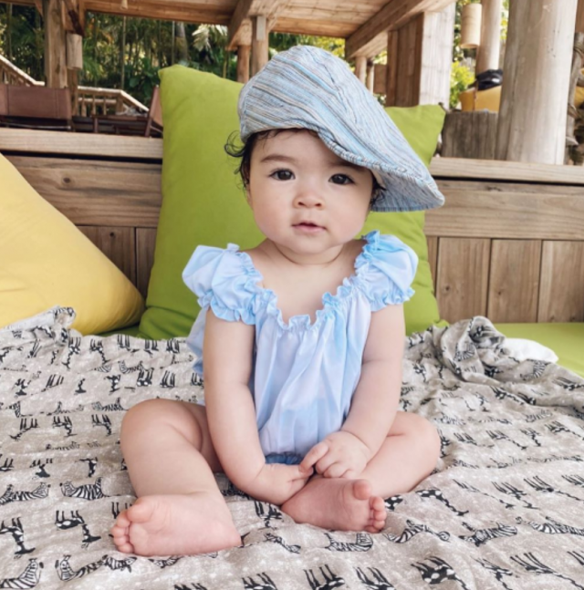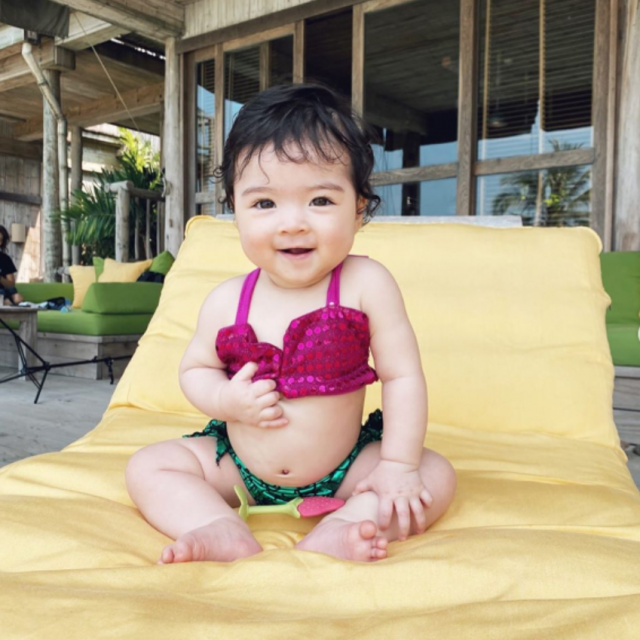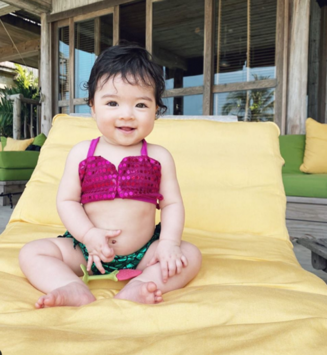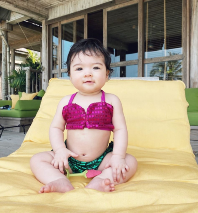 ทริปเที่ยวทะเลครั้งนี้น้องเดมี่ ขอจัดเต็มใส่ชุดว่ายน้ำทรูพีช เหมือนแม่ลิเดียบ้าง มาด้วยชุดนางเงือกน้อยแสนสวย เสื้อเอวลอยสีชมพู กางเกงสีชมพู แจกลอยยิ้มที่สดใสริมทะเลให้แฟนคลับได้อมยิ้มตามๆกันไป