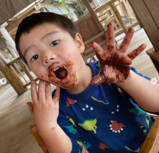 น้องดีแลน บุตรชายคนโต กำลังสนุกกับการกิน