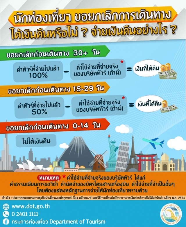 1 กรณีขอยกเลิกการเดินทาง 30 วันขึ้นไป ก่อนวันเดินทาง นักท่องเที่ยวสามารถขอรับเงินค่าบริการนำเที่ยวคืนได้เต็มจำนวนที่จ่ายไป