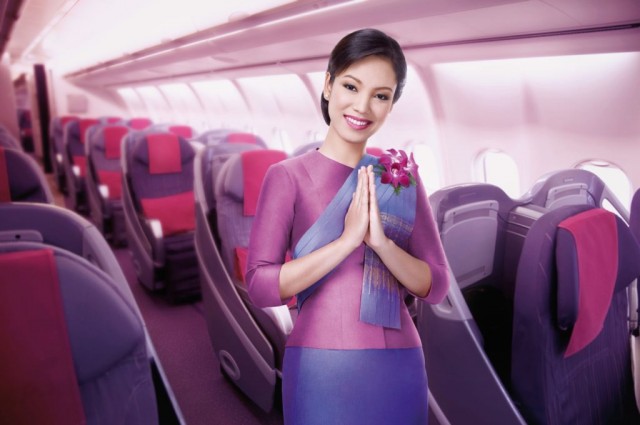 ปกติพนักงานต้อนรับหญิงบนเครื่องบินจะมีชุดที่ใส่ให้บริการบนเครื่องในเส้นทางระยะไกล 2 แบบ คือในเที่ยวขาออกจากไทยจะใส่ชุดไทยให้บริการ เพื่อแสดงให้เห็นถึงเอกลักษณ์ความเป็นไทย และเมื่อเครื่องบินจะลงยังจุดหมายปลายทาง จะต้องเปลี่ยนเครื่องแบบเป็นชุดสูทกับประโปรง โดยพนักงานต้อนรับจะต้องเปลี่ยนชุดในห้องน้ำและกลับมาให้บริการผู้โดยสารต่อ