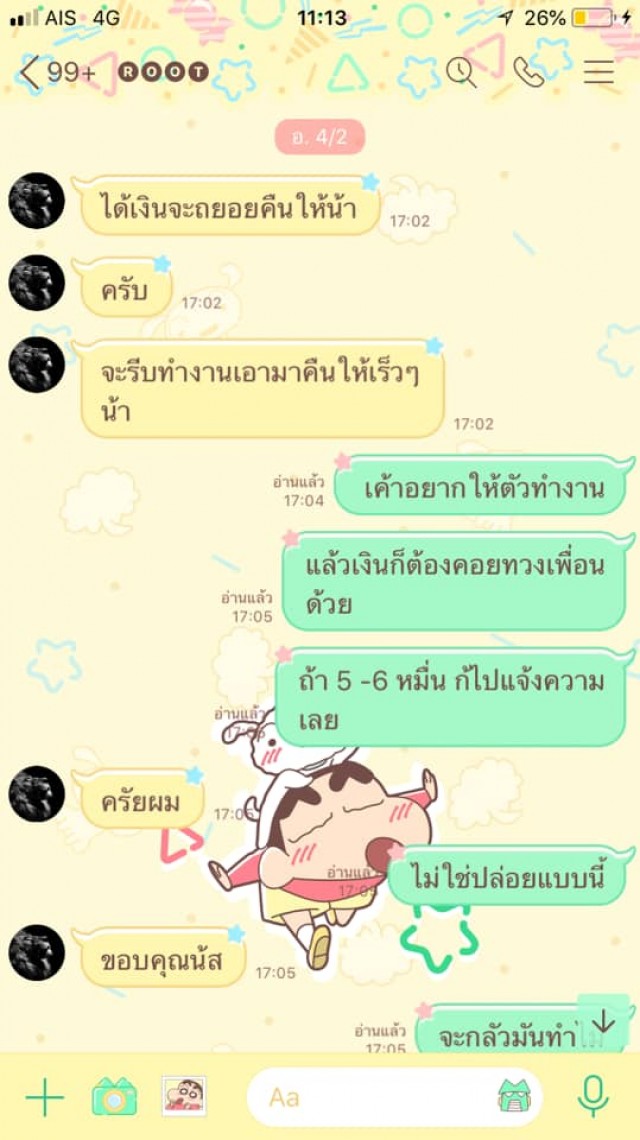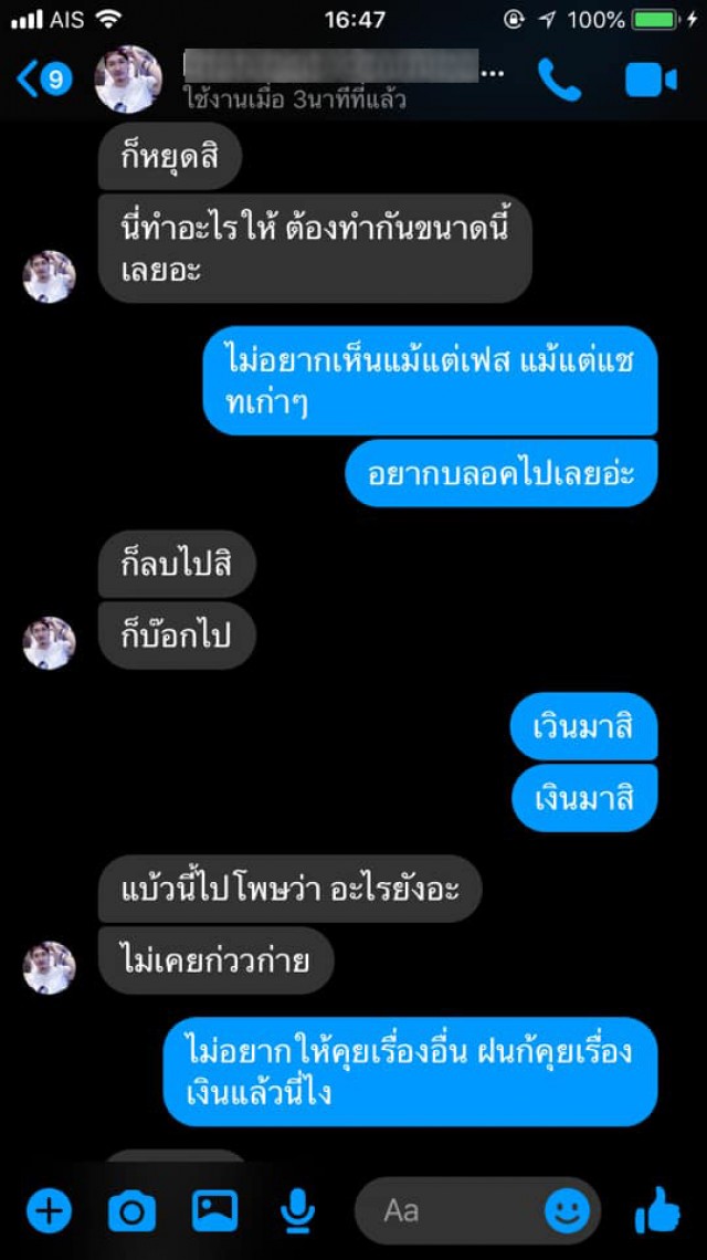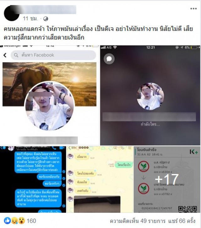 จะเห็นได้ว่าหนุ่มคนนี้ ไม่เคยชวนคุยเรื่องอื่นเลย นอกจากเรื่องเงิน แถมยังมีข้ออ้างสารพัดเพื่อที่จะได้เงินมาอีก สาวคนดังกล่าวจึงโอนให้ด้วยความไว้ใจ สุดท้ายแฟนหนุ่มคนนี้กลับไม่มีความจริงใจให้กันเลยตั้งแต่คบกันมา จะอย่างไรก็ตามหญิงสาวคนดังกล่าวก็ได้หูตาสว่างแล้ว ทางทีมงานขอเป็นกำลังใจสาวท่านนี้พบเจอเนื้อคู่เร็วๆนะคะ