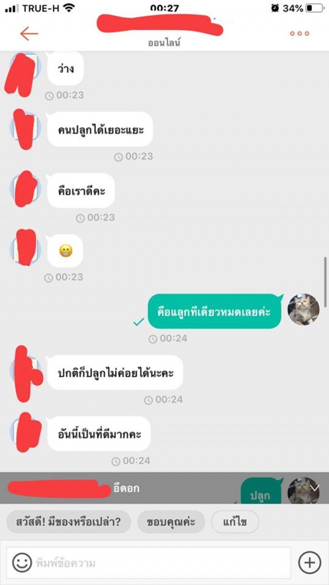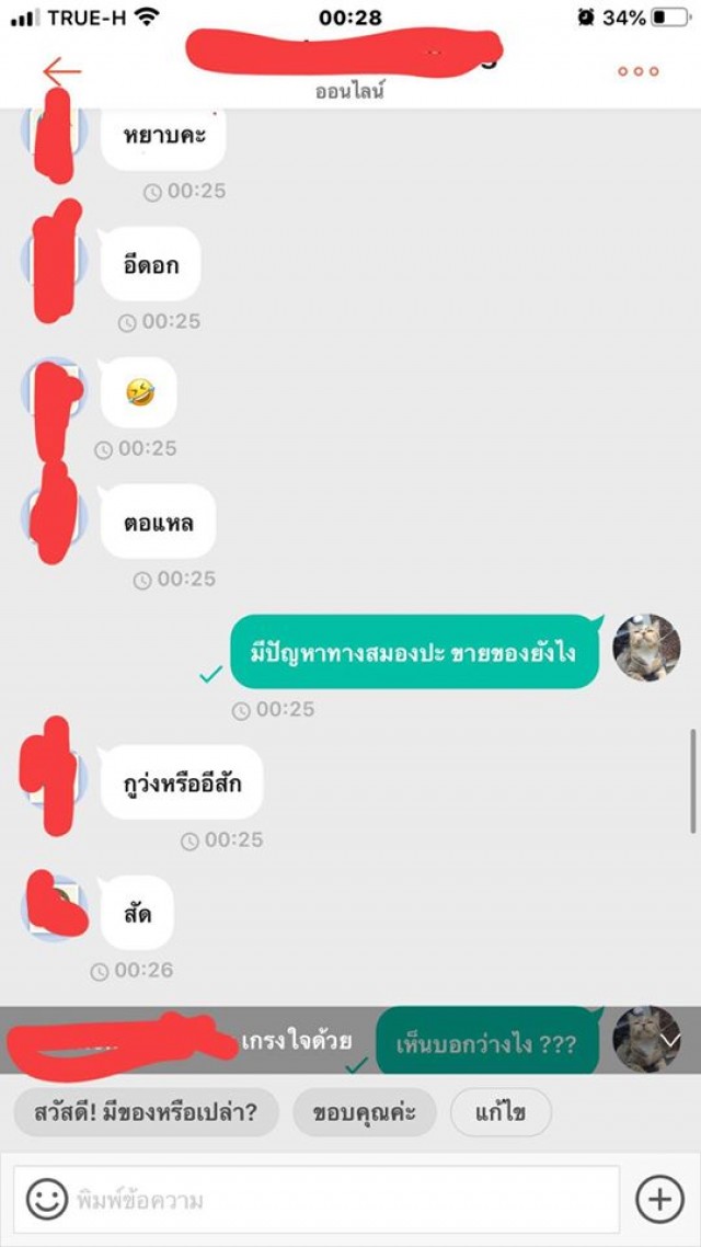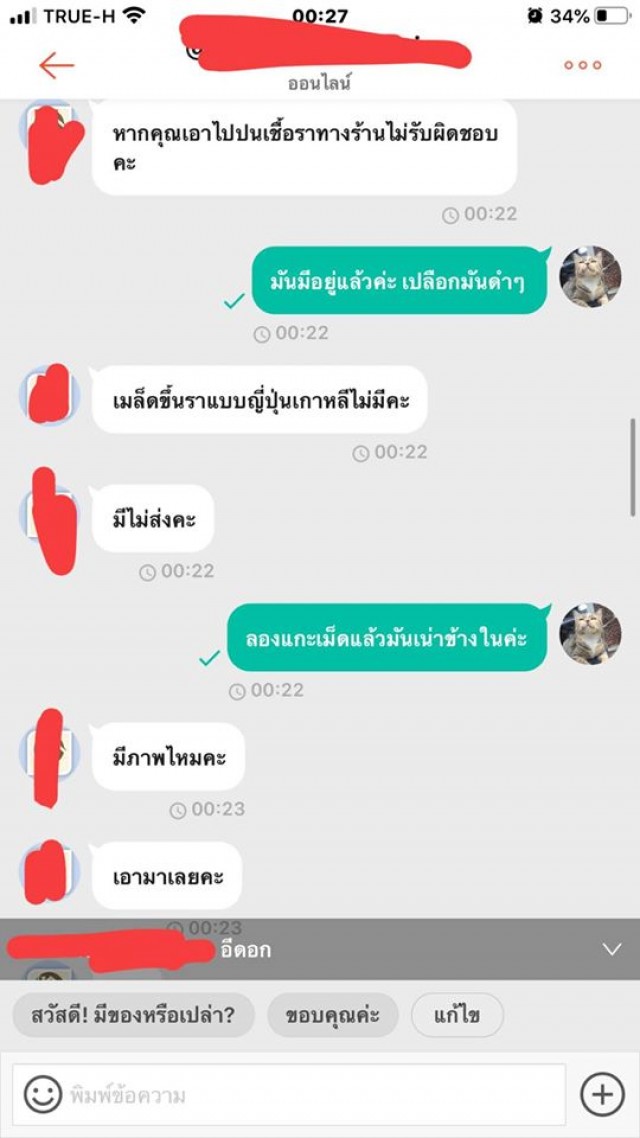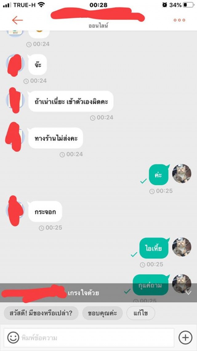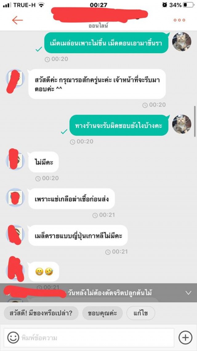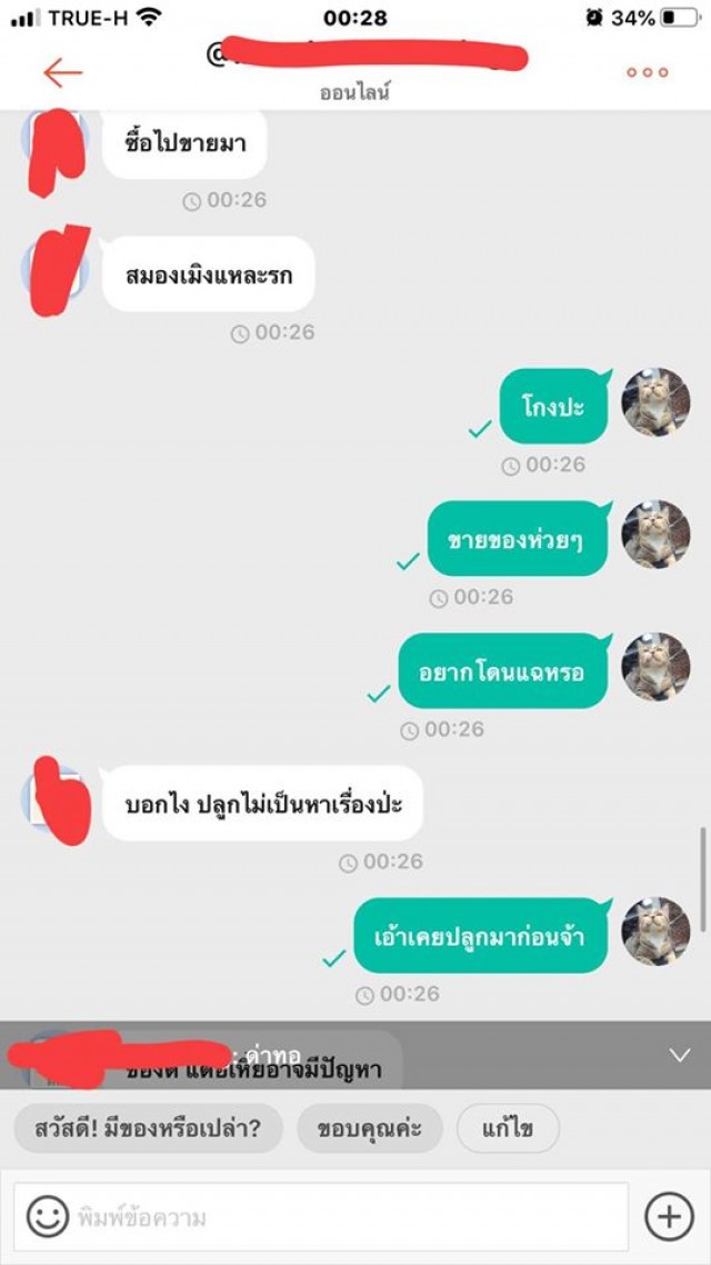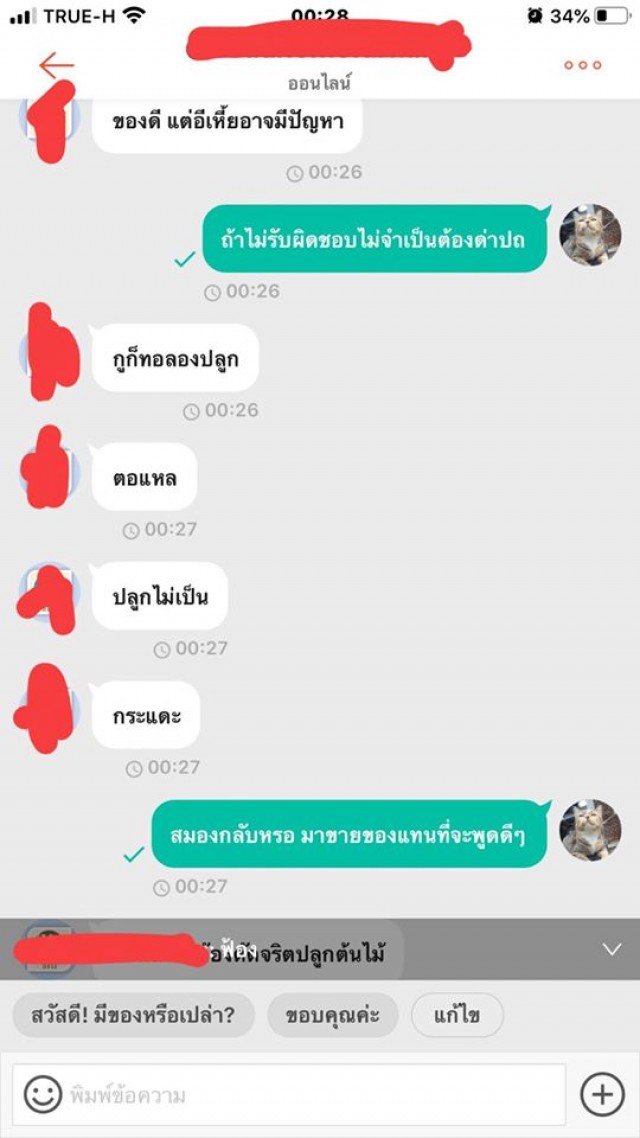 คือโมโหมากบอกเลย เราไปถามเค้าดีๆ ถ้าบอกว่าไม่รับผิดชอบเราก็ไม่ว่าอะไร นี่เริ่มแปลกๆตรงบอกว่า ว่าง ละ เหมือนกวน คือแบบเหมือนจิตๆ เราไปทำอะไรให้อะ ว่าเราขนาดนี้ คือแฟนเราว่าเค้าหลังจากคำว่ากระจอก เพราะโมโห อยู่ๆมาว่าเฉยเลย เป็นแม่ค้าคือคุยแบบนี้ได้ยังไง เราจะทำยังไงกับคนแบบนี้ได้บ้าง คือเค้าขู่จะฟ้องเราด้วย งงมาก เมล็ดเราลืมให้แฟนถ่ายไว้ เพราะเค้าเอาไปแช่น้ำแล้วตัวรามันไม่เห็น เลยยังไม่ทันได้บอกอะไร โดนว่ามาเลย พิมพ์ไปก็เหมือนคุยกับคนจิตไม่ปกติ คือโกรธจนตัวสั่น เราหยุดพิมพ์ไปยังมีพิมพ์ต่อว่าเราตามหลังมาอีก ต่อว่าแรง เกิดมายังไม่เคยโดยขนาดนี้ ซื้อของกับคนอื่นยังไม่เคยมีปัญหาเลย