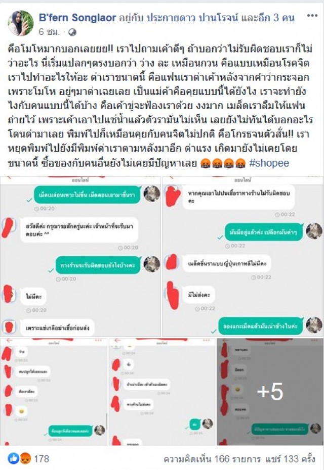 ล่าสุดได้มีผู้ใช้เฟซบุ๊ค B fern Songlaor ได้ซื้อสินค้าออนไลน์ผ่านทางแอปพลิเคชั่นชื่อดังแห่งหนึ่ง โดยได้กดสนทนาผ่านช่องแชทร้านค้าของทางแอป เนื่องจากของที่สั่งซื้อจากร้านดังกล่าวมีปัญหา ทางร้านค้าก็ได้ตอบโต้ลูกค้าคนดังกล่าวอย่างเช่นปกติ แต่อยู่ดีๆก็เกิดการต่อว่าอย่างเสียๆหายๆ โดยผู้ใช้เฟซบุ๊ค B fern Songlaor ได้โพสต์ข้อความพร้อมภาพหน้าจอการสนทนากับร้านค้าพร้อมระบุข้อความว่า