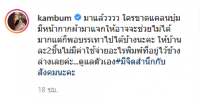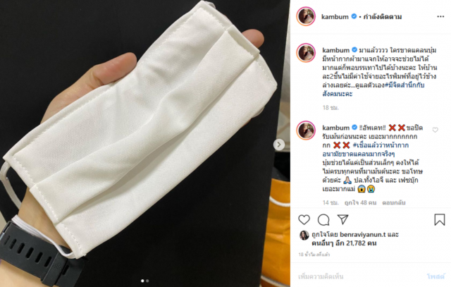 ล่าสุด แก้มบุ๋ม ได้โพสต์ภาพหน้ากากอนามัย พร้อมข้อความว่า มาแล้ว ใครขาดแคลนบุ๋มมีหน้ากากผ้ามาแจกให้อาจจะช่วยไม่ได้มากแต่ก็พอบรรเทาไปได้บ้างนะคะ ให้บ้านละ 2 ชิ้น ไม่มีค่าใช้จ่ายอะไรพิมพ์ที่อยู่ไว้ข้างล่างเลยค่ะ ดูแลตัวเอง มีจิตสำนึกกับสังคมนะคะ หลังจากชาวโซเชียลเข้ามาเห็นโพสต์นี้ ต่างพากันเขียนชื่อ ที่อยู่ว้ให้สาวแก้มบุ๋ม เพื่อรอรับหน้ากากอนามัยฟรี
