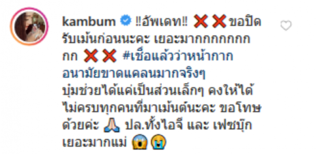 แต่เนื่องจากจำนวนคนที่ต้องการรับหน้ากากอนามัยเยอะกว่าจำนวนหน้ากากอนามัยที่จะแจก จนสาวแก้มบุ้มต้องประกาศปิดรับคอมเมนต์ก่อน โดยมีข้อความว่า อัพเดท ขอปิดรับเมนต์ก่อนนะคะ เยอะมากกกกกกกกก เชื่อแล้วว่าหน้ากากอนามัยขาดแคลนมากจริงๆ บุ๋มช่วยได้แค่เป็นส่วนเล็กๆ คงให้ได้ไม่ครบทุกคนที่มาเมนต์นะคะ ขอโทษด้วยค่ะ ปล ทั้งไอจี และ เฟซบุ๊กเยอะมากแม่
