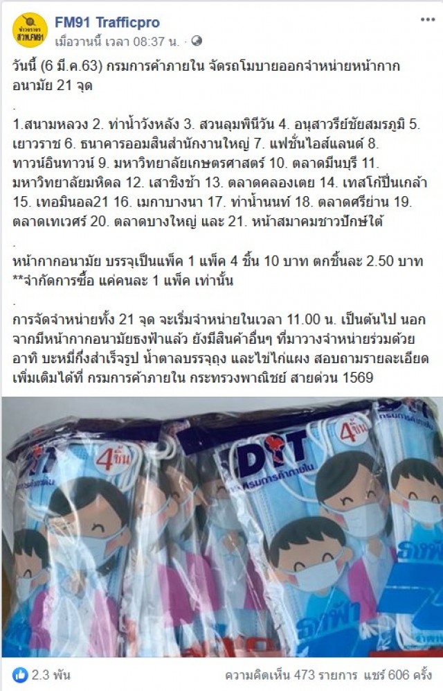 จากสถานการณ์ในปัจจุบัน ทำให้ประชาชนทั่วโลกรวมไปถึงประเทศไทยด้วย ที่กำลังขาดแคลนหน้ากากอนามัยอย่างมากเลยทีเดียว ซึ่งก็ได้มีบางคนกักตุนหน้ากากอนามัยไว้เพื่อขายแพงเป็นจำนวนมาก ล่าสุดทางเพจ FM91 Trafficpro ได้โพสต์แหล่งขายหน้ากากอนามัยทั้งหมด 21 จุด ในราคาถูก พร้อมระบุข้อความว่า