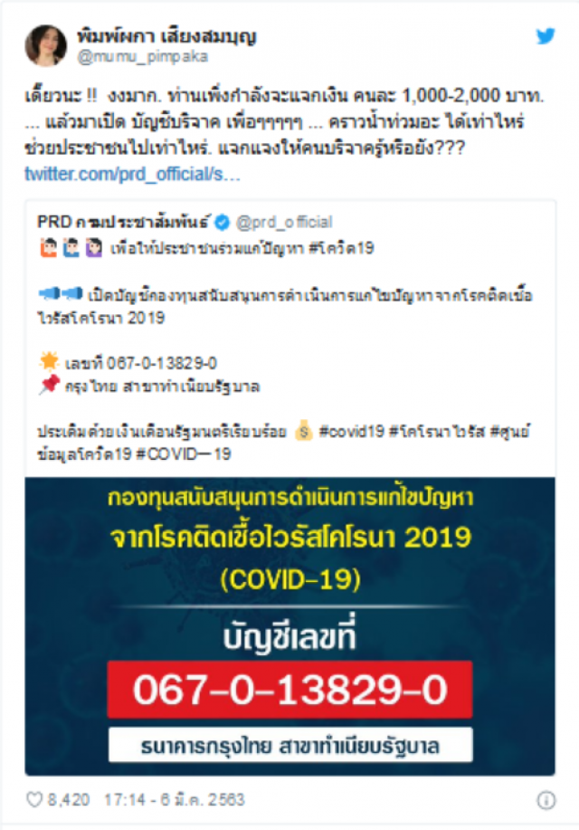 หมู พิมพ์ผกา ได้โพสต์ทวิตเตอร์ส่วนตัวที่ชื่อ mumu pimpaka ตั้งคำถามกลับไปยังรัฐบาลโดยข้อความระบุว่า เดี๊ยวนะ งงมาก ท่านเพิ่งกำลังจะแจกเงิน คนละ 1000 ถึง 2000 บาท แล้วมาเปิด บัญชีบริจาค เพื่อๆๆๆๆๆ คราวน้ำท่วมอะ ได้เท่าไหร่ ช่วยประชาชนไปเท่าไหร่ แจกแจงให้คนบริจาครู้หรือยัง