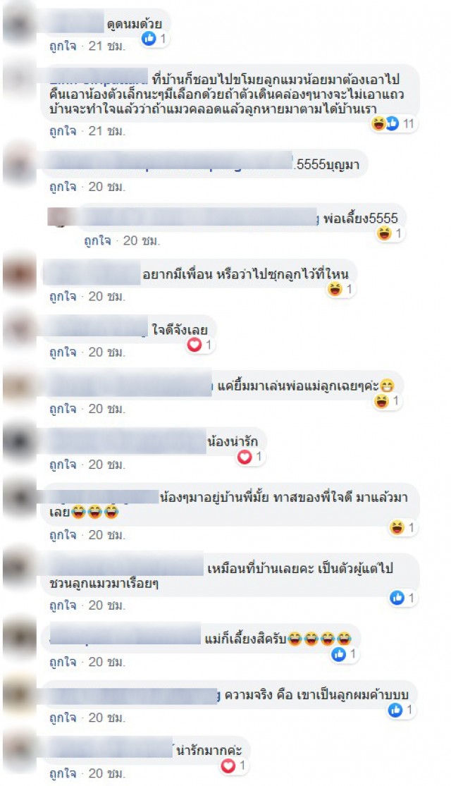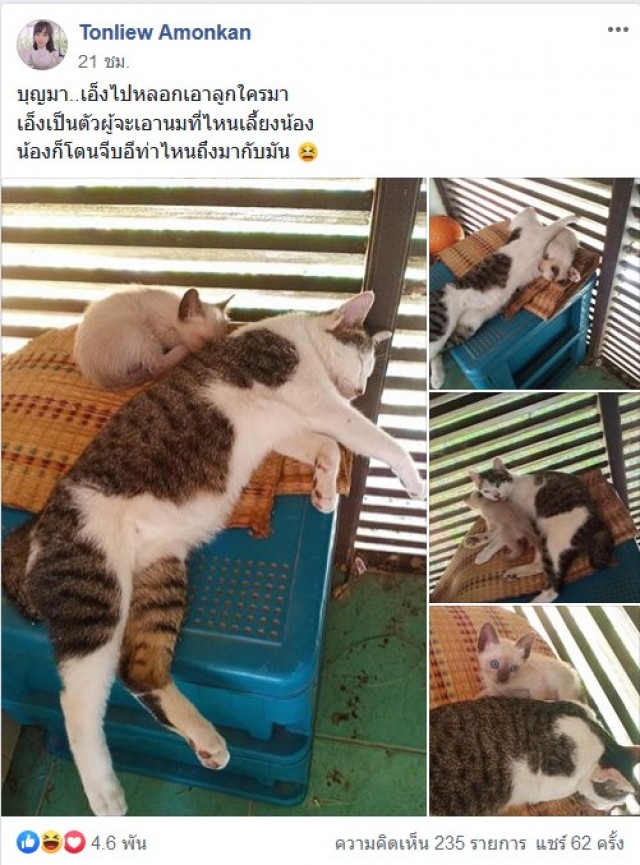 กลายเป็นเรื่องราวที่ชวนอมยิ้มไปตามๆกัน เมื่อได้มีผู้ใช้เฟซบุ๊ค Tonliew Amonkan ได้โพสต์ภาพของน้องเหมียวสุดรักซึ่งเป็นเพศผู้ ได้พาลูกแมวมานอนด้วยที่บ้าน งานนี้ทำเอาชาวโซเชียลต่างเข้ามาแสดงความแสดงความคิดเห็นกันเป็นจำนวนมาก ได้โพสต์ภาพพร้อมระบุข้อความว่า