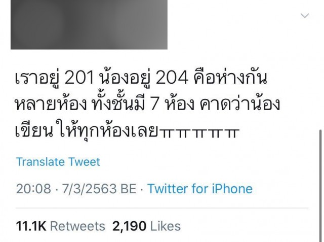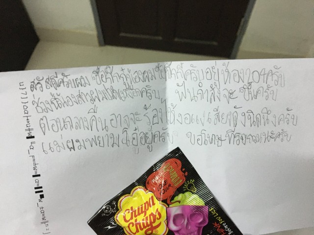 เจ้าของทวิตเตอร์เล่าต่อว่า เธออยู่ห้อง 201 และน้องอยู่ห้อง 204 ซึ่งคาดว่าน้องน่าจะเขียนข้อความนี้และแจกขนมขอโทษทุกห้องแน่ๆ เพราะน้องกลัวว่าเสียงงอแงของน้องจะไปรบกวนเพื่อนบ้านของตน